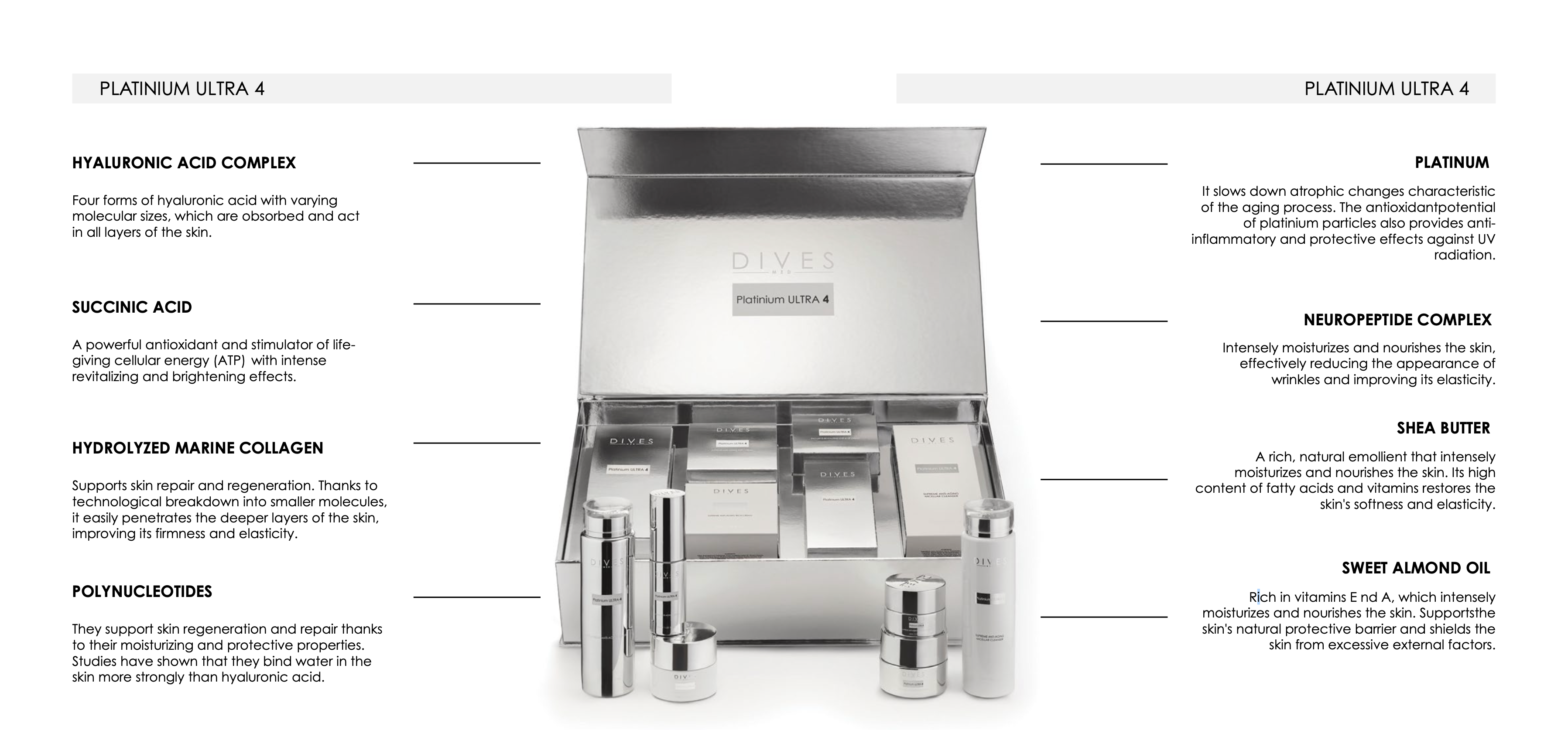 Platinium ULTRA 4 is the highest line of luxury care, offering the most advanced rejuvenating formulas. The unique collection, inspired by the iconic aesthetic treatment Platinium ULTRA 4, combines the synergy of the four largest and most frequently used substances in aesthetic medicine, creating technological perfection that redefines new standards of anti-age care. The use of the most effective ingredients used in aesthetic medicine allows you to exceed the boundaries of current care standards. Luxurious and technologically advanced formulas work on all levels, providing comprehensive rejuvenation and visible results.